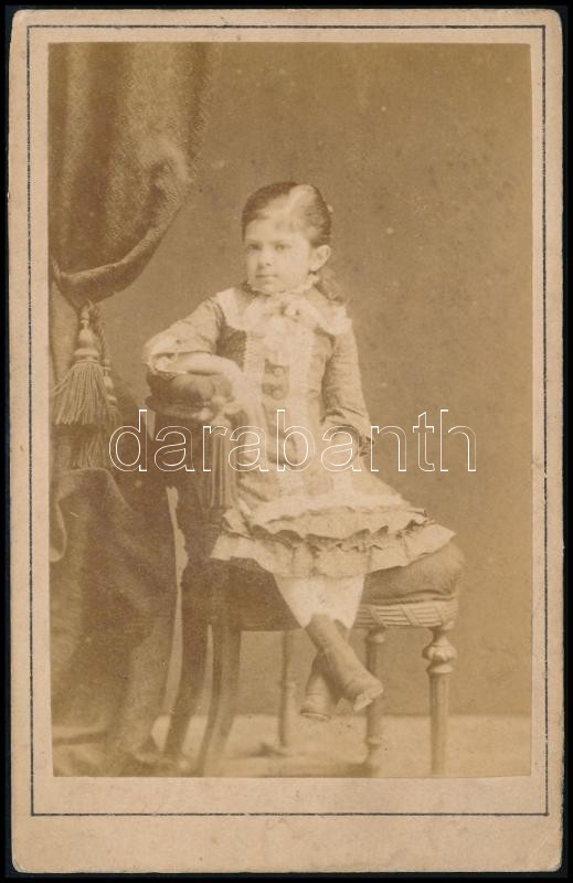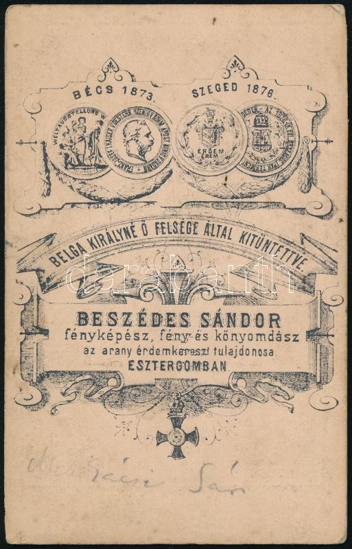 Beschreibung: cca 1876 Beszédes Sándor (?-?) esztergomi fényképíró műtermében készült, vizitkártya méretű fénykép, hátoldalán név szerepel, 10,5x6,5 cm