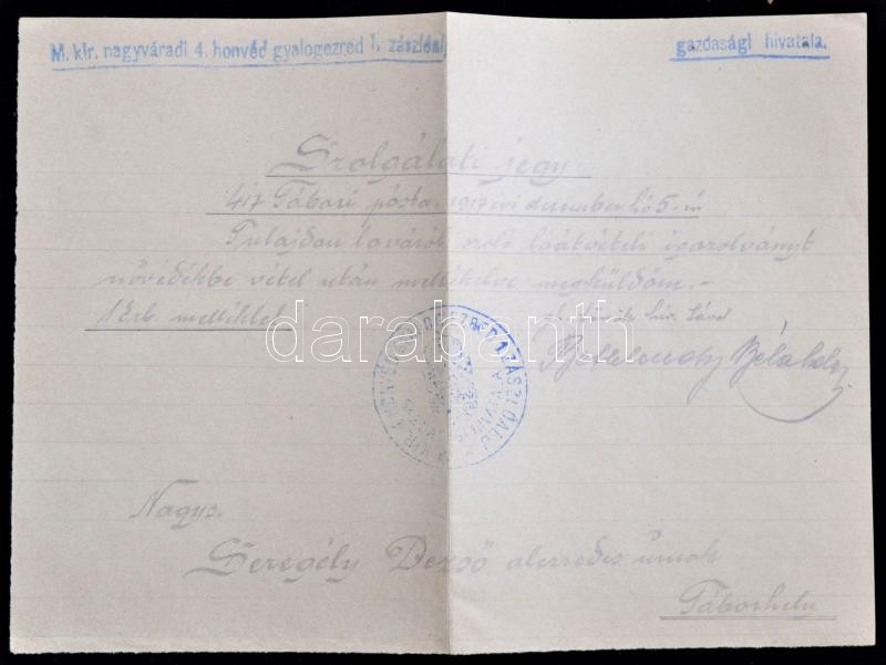 1917 Szolgálati jegy lóátvételi igazolvánnyal kapcsolatban, m. kir. na... https://www.darabanth.com/de/345-Fernauktion/345.0/Kunst-Dokumente-andere-Sammelgebiete/Militaria~500028/1917-Szolgalati-jegy-loatveteli-igazolvannyal-kapcsolatban-m-kir-nagyvaradi-4-honved-gyal~II1959743