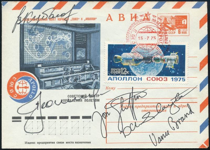1975 A Szojuz-Apollo program résztvevőinek aláírásai emlékborítékon: Alekszej Leonov (1934- ), Valerij Kubaszov (1935-2014), Thomas P. Stafford (1930- ), Vance D. Brand (1931- ) és Deke Slayton (1924-1993) /
