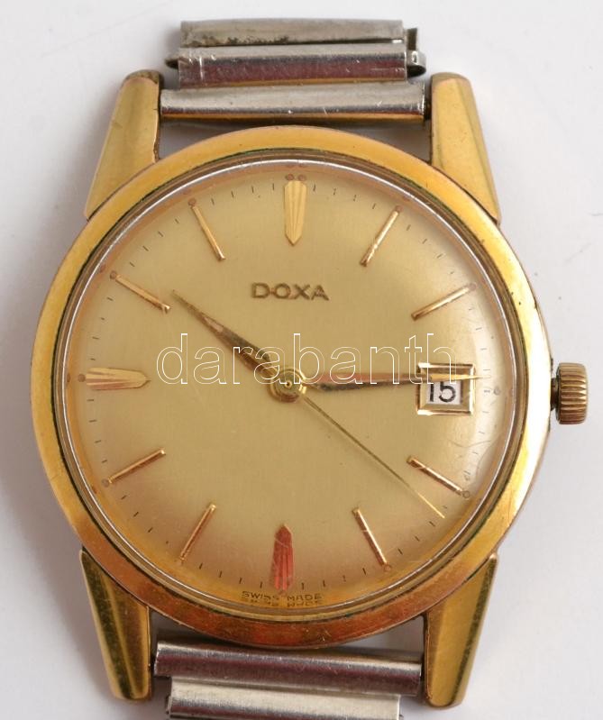 Beschreibung: Doxa aranyozott mechanikus, naptárfunkciós karóra. d:34mm, Működő jó állapotban, sérült modern fém szíjjal