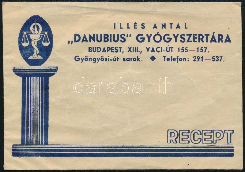 Illés Antal "Danubius" Gyógyszertára Budapest XIII. receptboríték https://www.darabanth.com/de/345-Fernauktion/345.0/Kunst-Dokumente-andere-Sammelgebiete/Werbungen~500022/Illes-Antal-Danubius-Gyogyszertara-Budapest-XIII-receptboritek~II1956930