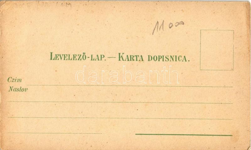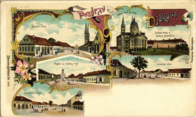 Diakovár, Djakovo, Dakovo; Glavna ulica, Kasarnick ulica, Glavna trg, Satnicka ulica, Stolna crkva od zada, Ostatak tvrdje iz turskog gospodstva / streets, square, church, Turkish Empire era fortress, shops of Leopold Kugel, Adolf Kohn, Heinrich Bruck and Franjo Jaksevac. Art Nouveau, floral, litho (EK)