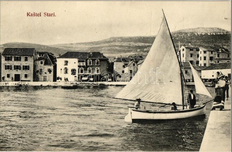 Kastel Stari, Castelvecchio (Kastela, Castelli); beach, molo, sailboat... https://www.darabanth.com/de/346-Fernauktion/346.0/Ansichtskarten/Kroatien~2000009/Kastel-Stari-Castelvecchio-Kastela-Castelli-beach-molo-sailboat-EK~II1964194