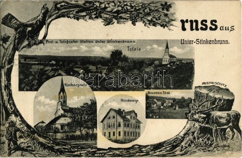 Beschreibung: 1907 Unterstinkenbrunn, Kirchenplatz, Kinderasyl, Brunnen Thal, Muster Schutz / church, valley, children asylum. Art Nouveau with hunter and deer