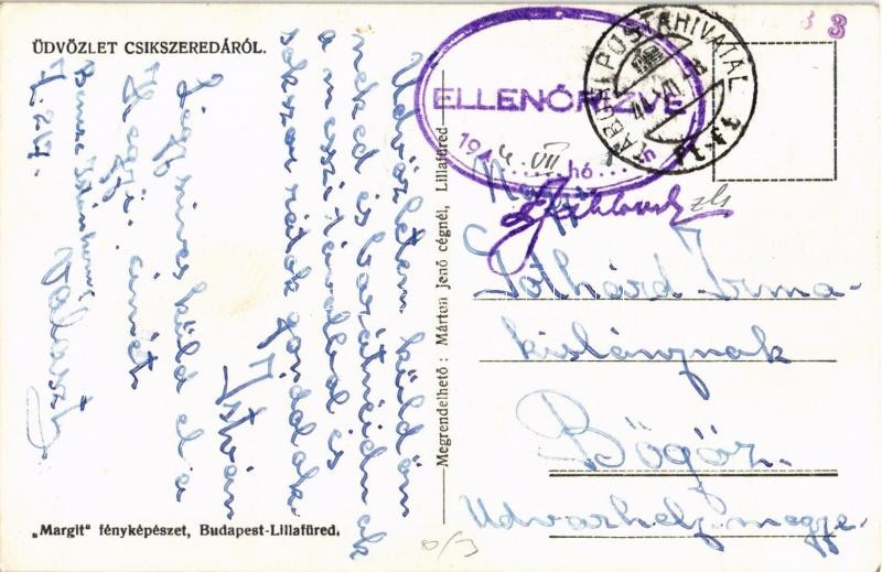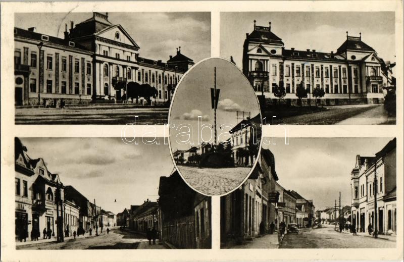Csíkszereda, Miercurea Ciuc; Városháza, Országzászló, utcakép, üzletek, automobil / town hall, Hungarian flag, street views, shops, automobile + 1944 Tábori postahivatal