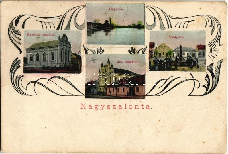 Nagyszalonta, Salonta; Baptista és izraelita templom, Toldy tér, jégpálya, piac, Kertész üzlete / Baptist church, synagogue, square, ice rink, market, shop. Art Nouveau (Rb)