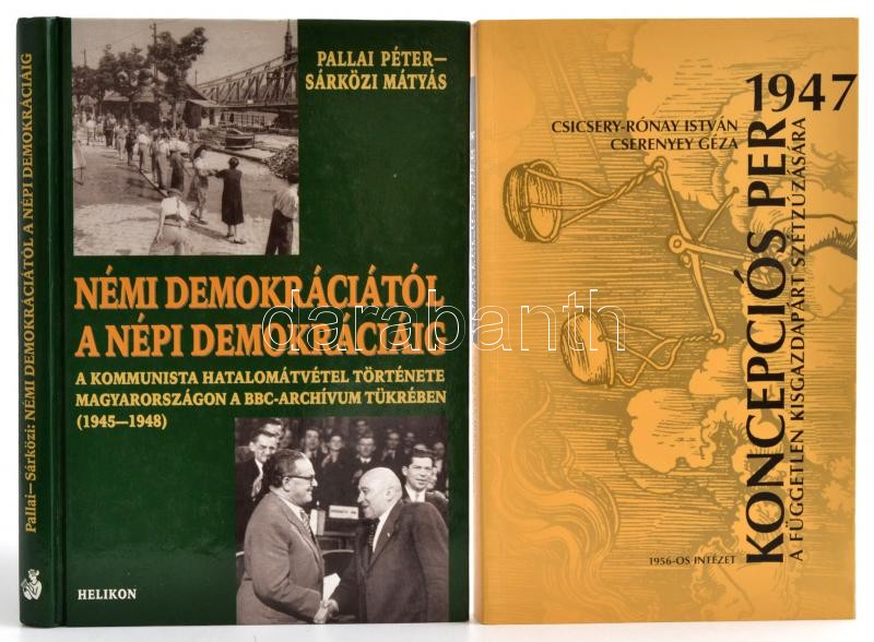 Beschreibung: 2 db történelmi könyv: Csicsery-Rónay István - Cserenyey Géza: Koncepciós per. A Független Kisgazdapárt szétzúzása, 1947. (Bp., 1998); Pallai Péter - Sárközi Mátyás: Némi demokráciától a népi demokráciáig. (Bp., 2008) PapÃr- illetve kartonált papÃrkötésben, jó állapotban.