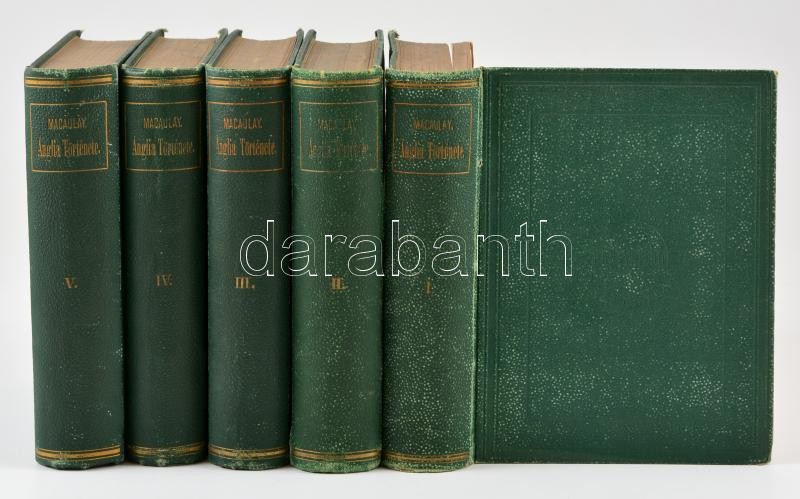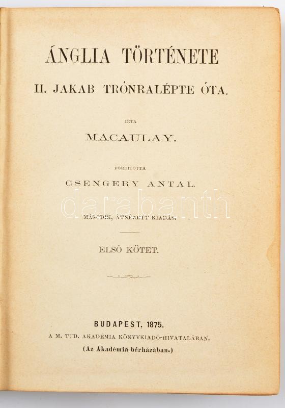 Macaulay: Ánglia története II. Jakab trónralépte óta. Forditotta Csengery Antal - Zichy Antal. Második, átnézett kiadás. I-V. kötet, a VI. kötet hiányzik. Bp, 1875-1877, MTA. Egységes, kiadói zöld vászonkötésben,