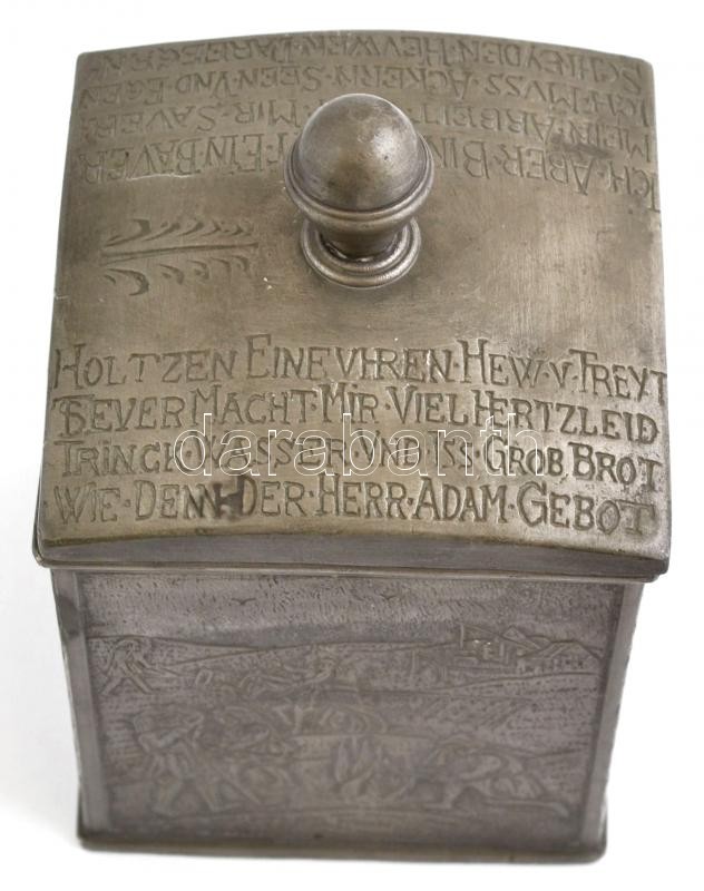 Beschreibung: XIX. sz. Ón dohány, vagy cukortartó doboz német veressel, mezőgazdasági jelenetekkel díszítve. / 19th century tin tobacco or sugar box Jelzett.m:17 cm