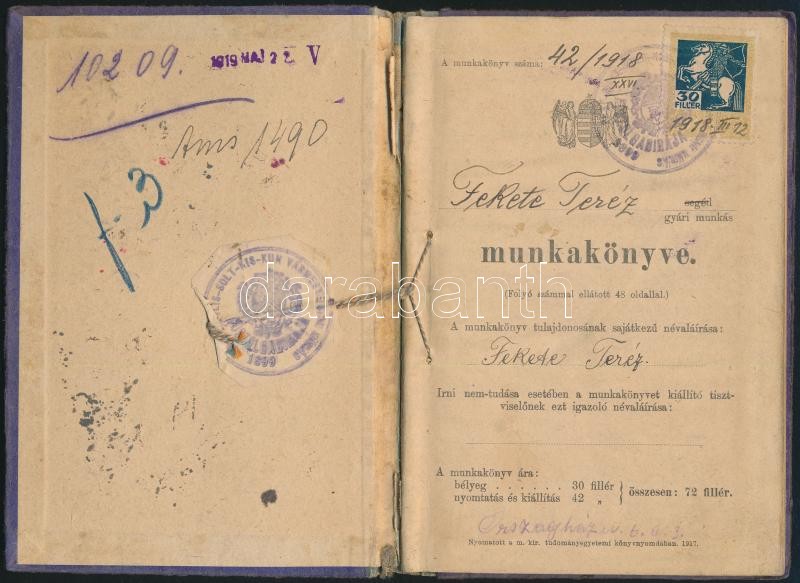 1906-1918 Cselédkönyv, biai személy részére.+Munkakönyv biai személy, ... https://www.darabanth.com/de/346-Fernauktion/346.0/Kunst-Dokumente-andere-Sammelgebiete/Dokument~500017/1906-1918-Cseledkonyv-biai-szemely-reszereplusMunkakonyv-biai-szemely-gyari-munkas-reszer~II1961791