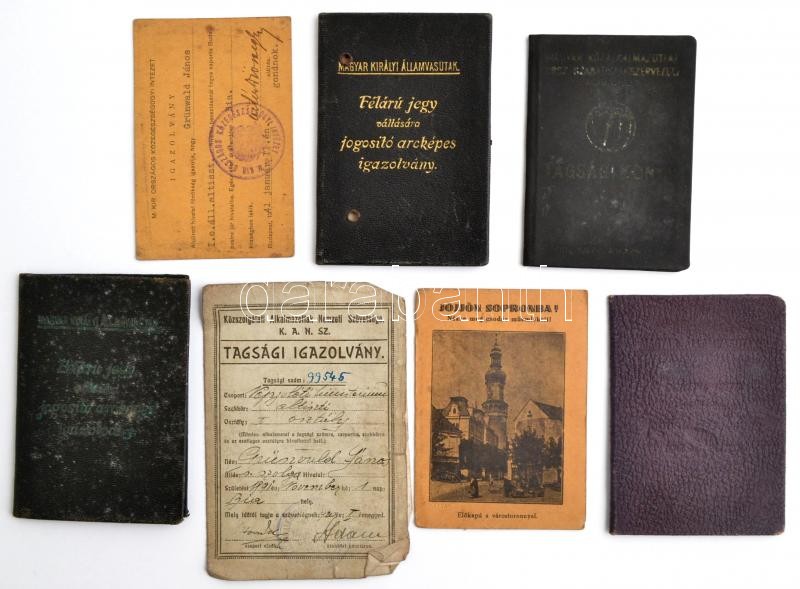 1923-1946 Vegyes okmányt tétel, 5 db, közte 3 db MÁV félárú jegy váltására jogosító fényképes igazolvánnyal,az egyikben a GYESEV 1940. évre szóló kiegészítő lapjával, Közszolgálati Alkalmazottak Nemzeti Szövetségének tagsági igazolványával, valamint a Magyar Közalkalmazottak Országos Szabadszakszervezetének igazolványaival. Változó állapotban, kopott borítókkal, K.A.N.SZ. igazolvány szakadozott.