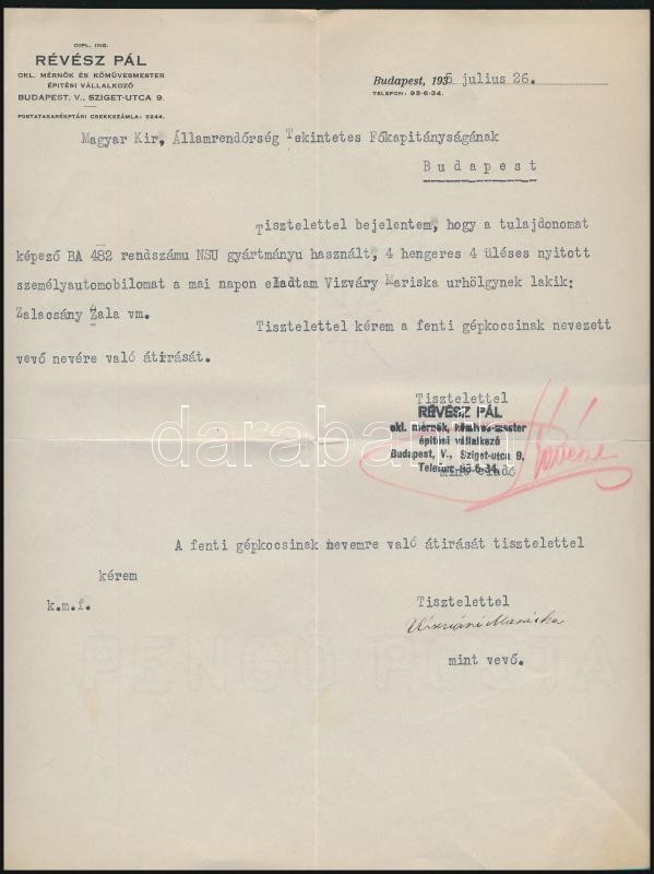 Beschreibung: 1935 Bp., Vízvári Mariska aláírása autóvásárlásról szóló okmányon