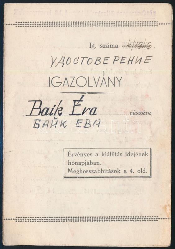 Beschreibung: 1946 Orosz-magyar nyelvű málenkij robot alól mentesító igazolvány.