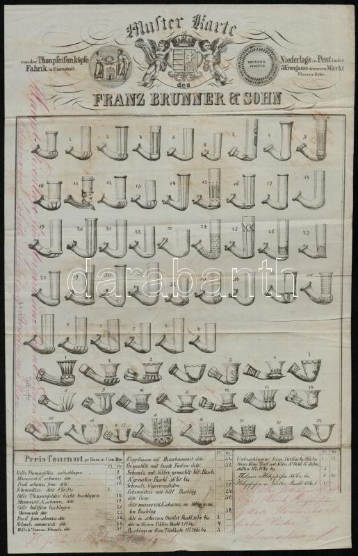 1856 Franz Brunner & Sohn Thonpfeifenköpfe Fabrik und Niederlage Eisen... https://www.darabanth.com/de/346-Fernauktion/346.0/Kunst-Dokumente-andere-Sammelgebiete/Drucksachen~500029/1856-Franz-Brunner-Sohn-Thonpfeifenkopfe-Fabrik-und-Niederlage-Eisenstadt-Pest-Musterkarte-min~II1964333