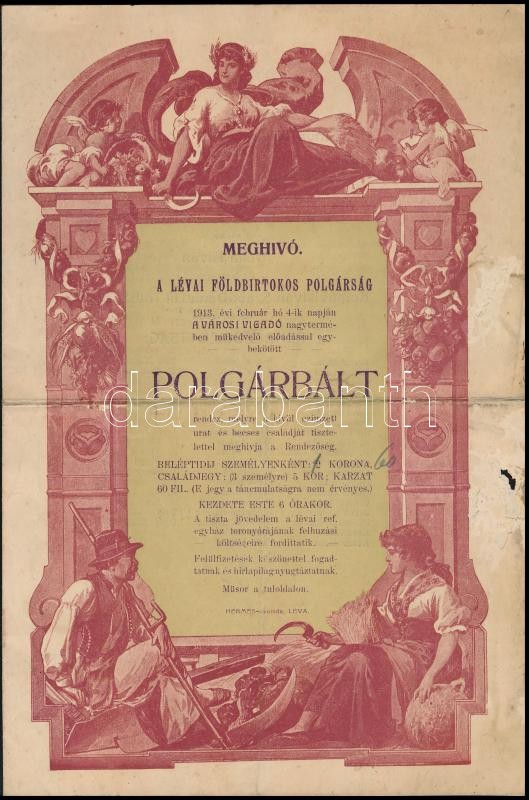 1913 Léva földbirtokosok polgárbálja nagyalakú meghívó, sérült. 4 p. 2... https://www.darabanth.com/de/346-Fernauktion/346.0/Kunst-Dokumente-andere-Sammelgebiete/Drucksachen~500029/1913-Leva-foldbirtokosok-polgarbalja-nagyalaku-meghivo-serult-4-p-21x30-cm~II1965355