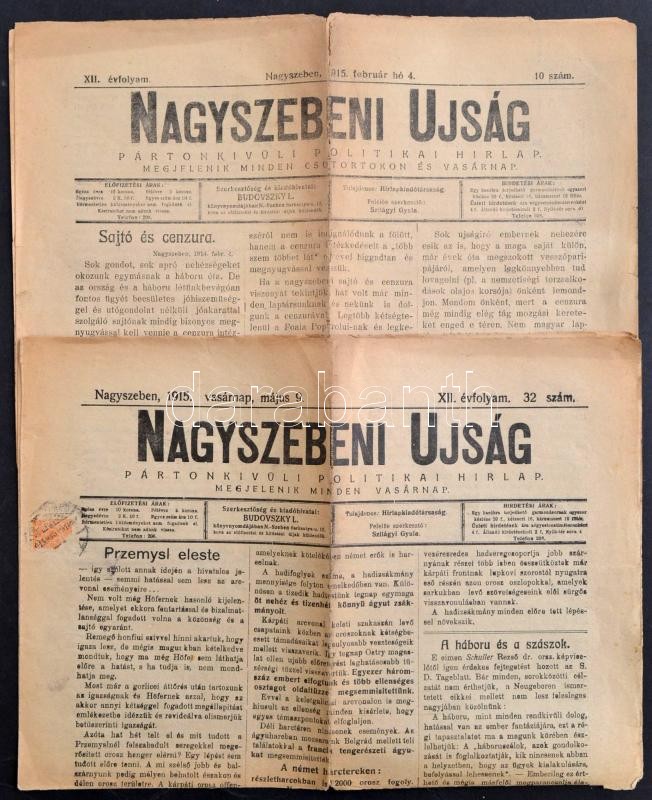 1915 Nagyszebeni Ujság. 1915. február. 4., május 9. XII. évf. 10., 32. számok, szakadtak, sérültek, 2x4 p. Az egyik címlapján Przemysl elestének hírével.