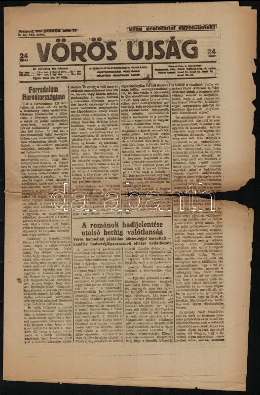 1919 a Vörös Újság 6. évf. 143. lapszáma (júl. 25.), számos érdekes hí... https://www.darabanth.com/de/346-Fernauktion/346.0/Kunst-Dokumente-andere-Sammelgebiete/Drucksachen~500029/1919-a-Voros-Ujsag-6-evf-143-lapszama-jul-25-szamos-erdekes-hirrel~II1966067