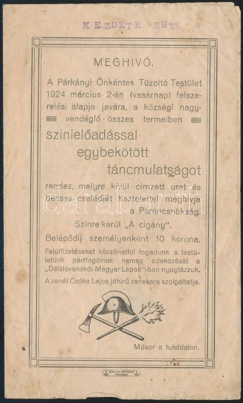 1924 Meghívó a Párkányi Önkéntes Tűzoltó Testület színielőadással egyb... https://www.darabanth.com/de/346-Fernauktion/346.0/Kunst-Dokumente-andere-Sammelgebiete/Drucksachen~500029/1924-Meghivo-a-Parkanyi-Onkentes-Tuzolto-Testulet-szinieloadassal-egybekotott-tancmul~II1946179