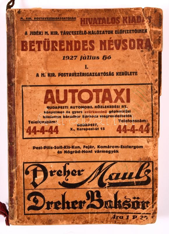 1927 Telefonkönyv. A vidéki m. kir. távbeszélő hálózatok előfizetőinek... https://www.darabanth.com/de/346-Fernauktion/346.0/Kunst-Dokumente-andere-Sammelgebiete/Drucksachen~500029/1927-Telefonkonyv-A-videki-m-kir-tavbeszelo-halozatok-elofizetoinek-beturendes-nevsora~II1940451