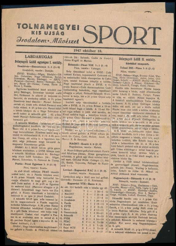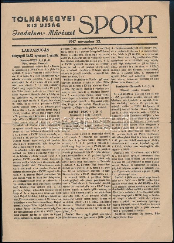1947 Tolnamegyei Kis Újság Sport 1947. okt. 18., nov. 22., hajtásnyomm... https://www.darabanth.com/de/346-Fernauktion/346.0/Kunst-Dokumente-andere-Sammelgebiete/Drucksachen~500029/1947-Tolnamegyei-Kis-Ujsag-Sport-1947-okt-18-nov-22-hajtasnyommal-az-egyik-szam-szelein~II1961759