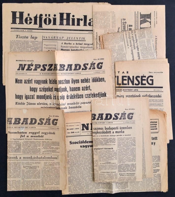 1956 Vegyes 1956-os újság tétel, 9 db, közte Hétfő Hírlap I. évf. 1. szám, 1956. okt. 8., Magyar Függetlenség I. évf. 3. szám. 1956. okt. 31., Kis Ujság. I. évf. 3. sz., 1956. nov. 2., Szabad Nép. 1956. okt. 29, Népszava 1956. nov. 1., Népszabadság I. évf. 7. (x2), 11., 13. számok. Változó állapotban.