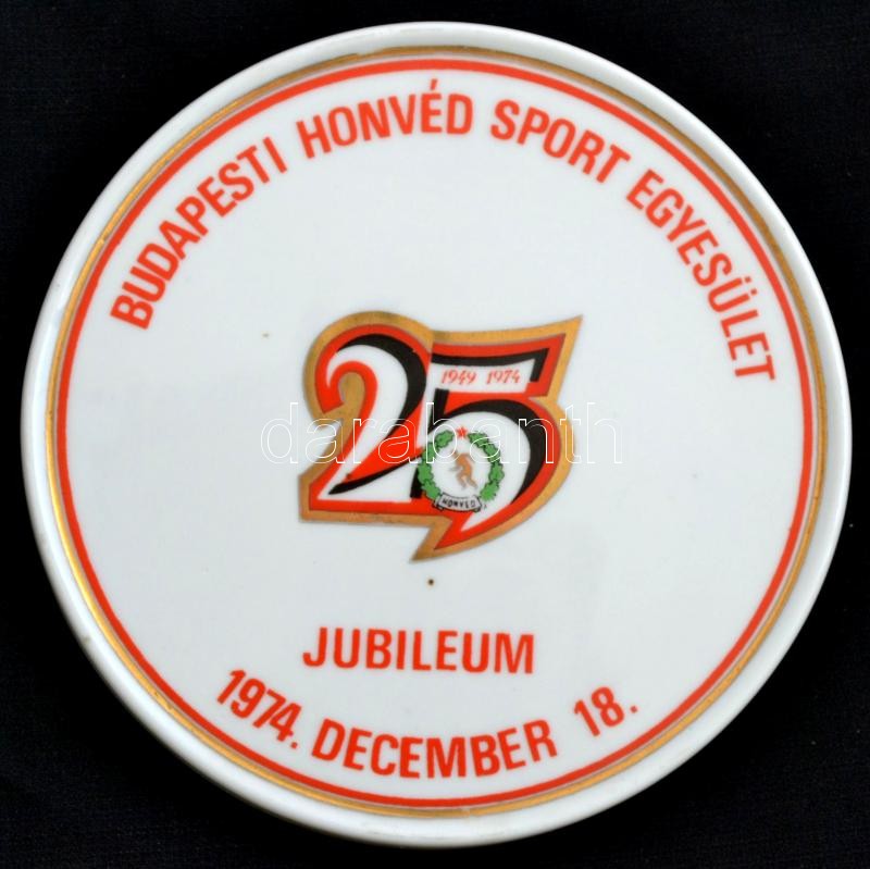 Beschreibung: 1974 "Hajrá Honvéd!" a Budapesti Honvéd Sport Egyesület jubileumi képes híradója III. szám + porcelán plakett, d: 13,5 cm