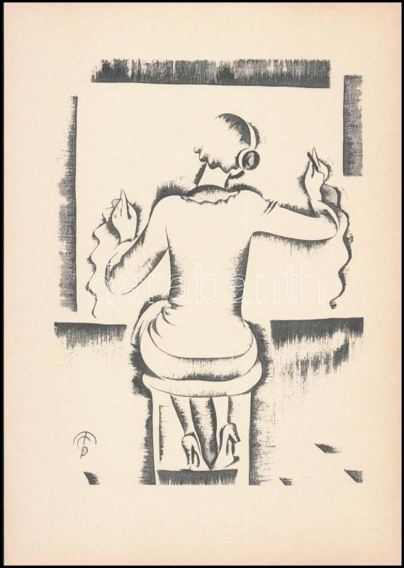Beschreibung: Molnár C. Pál (1894-1981): Telefonos kisasszony, kis szériás ofszet, papír, 30×21 cm