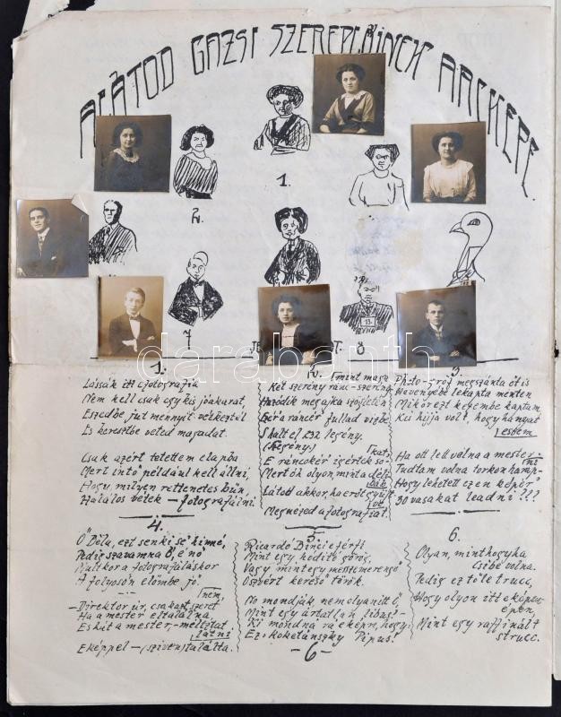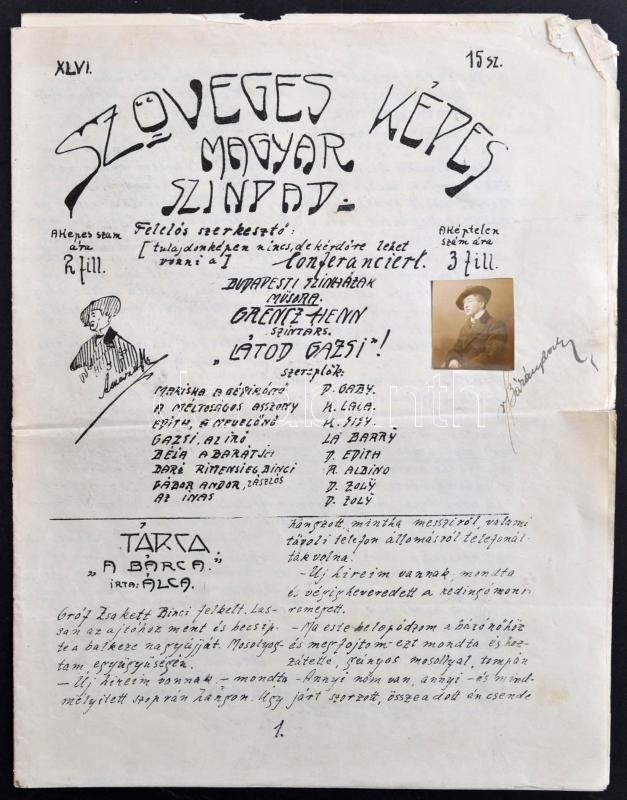 cca 1900-1910 Szöveges Képes Magyar Színpad. XLVI. 15 sz. Humoros iskolai színházi lap. Benne beragasztott fotókkal, szakadt, az egyik sarkán lyukakkal, 8 sztl. lev.