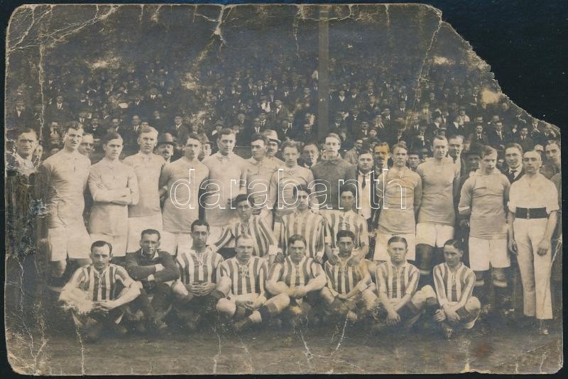 1921 A Ferencváros labdarúgó csapata és a göteborgi Kamraterna csapata az 1921. márciusi Húsvéti Tornán vívott meccse utáni csoportképen (FTC győzött 1:0-ra) a Hungária úton, hátoldalon feliratozott fotó (FTC: Csajka, Wiener, Hungler II., Szabó, Obitz, Tóth Potya, Schwartz, Kertész, Nikolsburger, Wiener II), hátoldalon feliratozott, hiányos, sérült fotólap, 8×12 cm