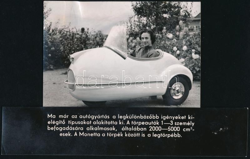 Monetta német törpeautó, eredeti sajtófotó, külön felirattal, 8×11,5 c... https://www.darabanth.com/de/346-Fernauktion/346.0/Kunst-Dokumente-andere-Sammelgebiete/Foto~500020/Monetta-nemet-torpeauto-eredeti-sajtofoto-kulon-felirattal-8C39711-5-cm~II1966056