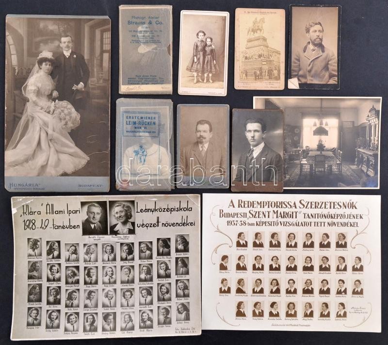 Beschreibung: cca 1880-1940 14 db nagyrészt keményhátú fotó. Tablóképek és vizitkártya