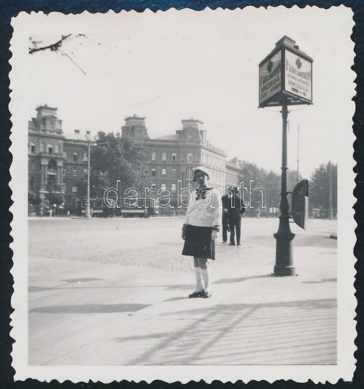 Beschreibung: cca 1930 Budapest, Kodály körönd, villamos és a Dr. Glück Szanatórium reklámoszlopa, fotó, 6×6 cm