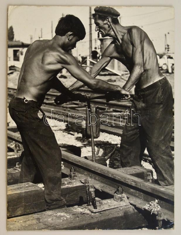 cca 1975 Banga András: Közös erővel, feliratozott vintage fotóművészeti alkotás, a magyar fotográfia dokumentarista korszakából, kasírozva, sarkán törésnyom, 40x30 cm