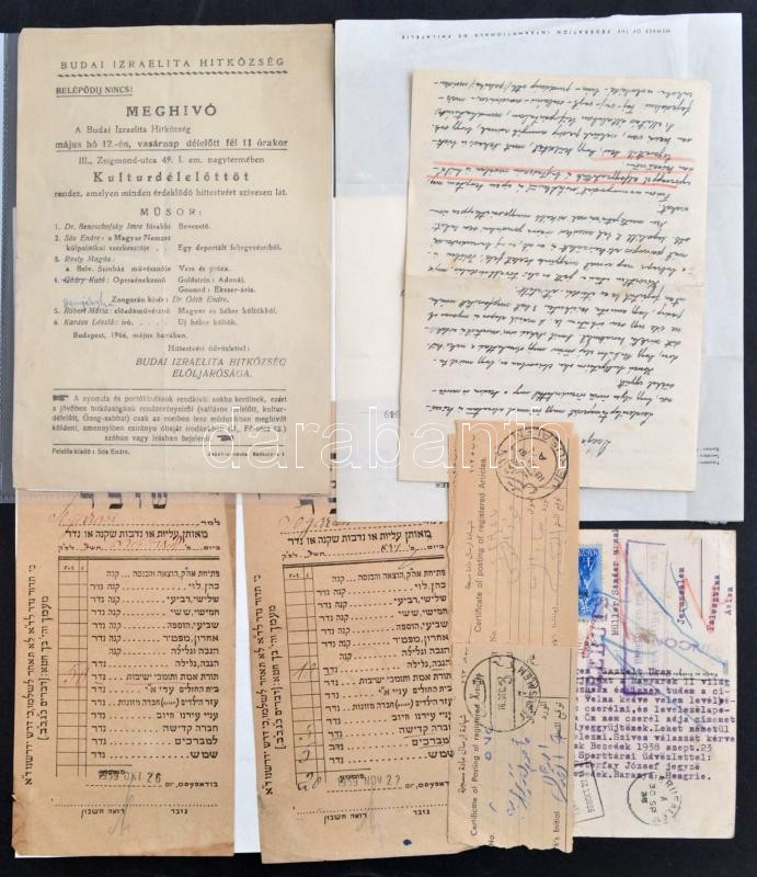 Beschreibung: 1938-1959 Judaika témájú nyomtatványok, közötte egy munkaszolgálatos levele