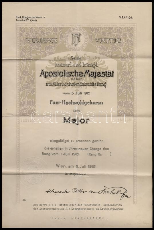 1915 Franz Lindenmayer ezredesi kinevezése Krobatin hadügyminiszter al... https://www.darabanth.com/de/346-Fernauktion/346.0/Kunst-Dokumente-andere-Sammelgebiete/Militaria~500027/1915-Franz-Lindenmayer-ezredesi-kinevezese-Krobatin-hadugyminiszter-alairasaval~II1963471