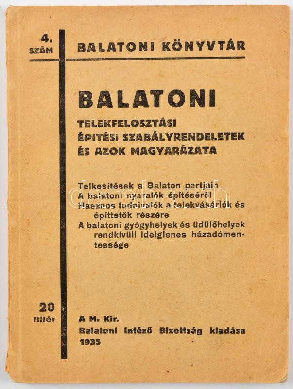 Balatoni telekfelosztási, építési szabályrendeletek és azok magyarázata. Bp., 1935, Magyar Királyi Balatoni Intéző Bizottság. Papírkötésben, jó állapotban.