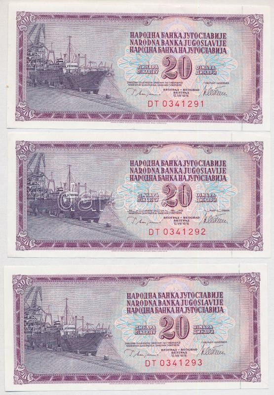 Yugoslavia 1978. 2... https://www.darabanth.com/de/346-Fernauktion/346.0/Numismatik/Weltweit-Banknoten~1000012/Jugoszlavia-1978-20D-3x-sorszamkovetok-TII-II--Yugoslavia-1978-20-Dinara-3x-sequential-s~II1965368