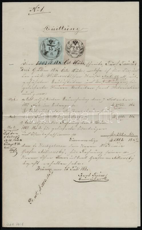 1868 Teljes okmány 15Fl + 2 Fl50kr illetékbélyeggel klf kiadásokkal https://www.darabanth.com/de/346-Fernauktion/346.0/Philatelie-und-Postgeschichte-Ungarn/Stempelmarken~500016/1868-Teljes-okmany-15Fl-plus-2-Fl50kr-illetekbelyeggel-klf-kiadasokkal~II1955857