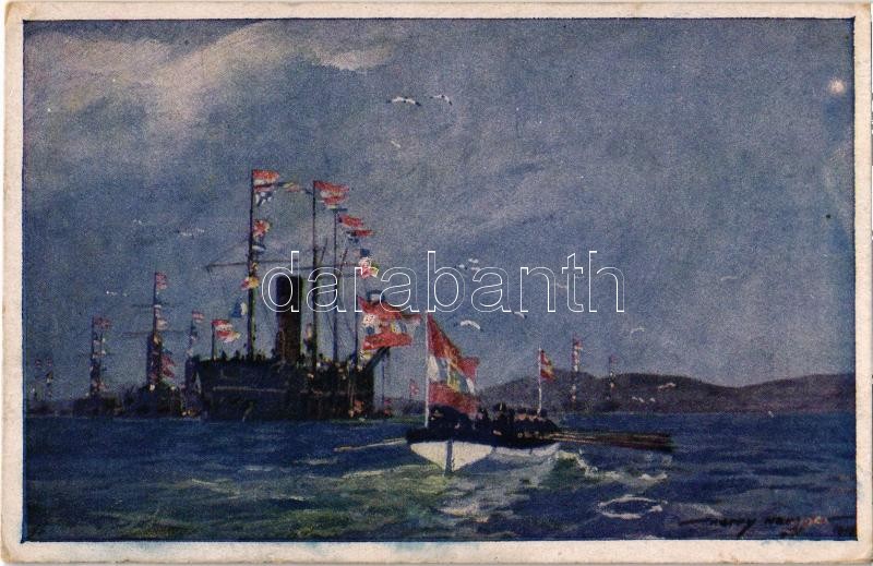 1918 Die Seeschlacht bei Lissa. Flaggengala in Hafen von Lissa. K.u.K. Kriegsmarine. Kriegshilfsbüro Nr. F. 112. / Battle of Lissa (1866), flagship SMS Erzherzog Ferdinand Max, battleships dressed overall with international maritime signal flags as a sign of celebration, mariners in boat, naval flag s: Harry Heusser (EK)