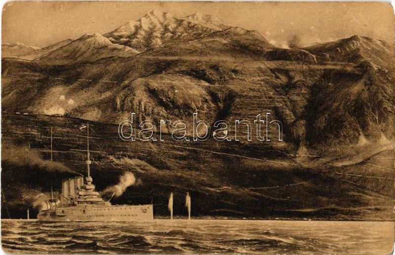 Beschiessung der auf dem Lovcen befindlichen montenegrischen Stellungen durch SMS Karl VI und Forts im Herbste 1914 / SMS Kaiser Karl VI Osztrák-Magyar Haditengerészet VI. Károly-osztályú páncélos cirkálója lövi a montenegrói állásokat és erődöket Lovcennél 1914 őszén / WWI Austro-Hungarian K.u.K. Kriegsmarine SMS Kaiser Karl VI armored cruiser fires at the Montenegrin forts and positions by Lovcen (kopott sarkak / worn corners)