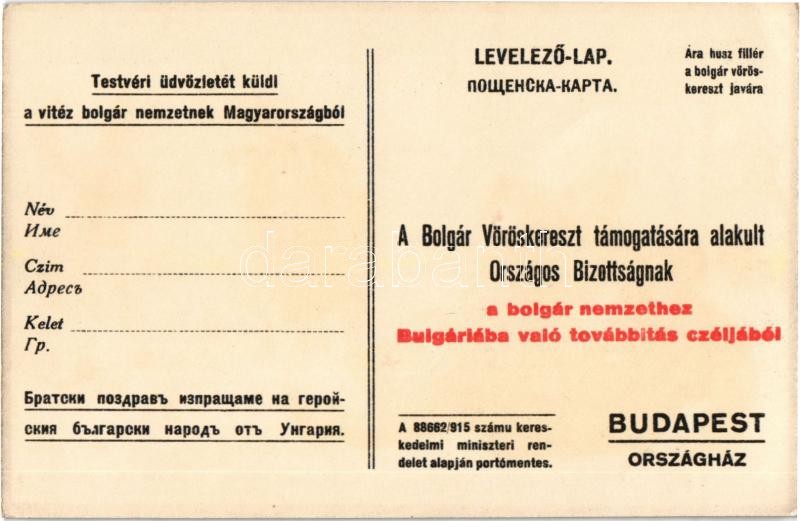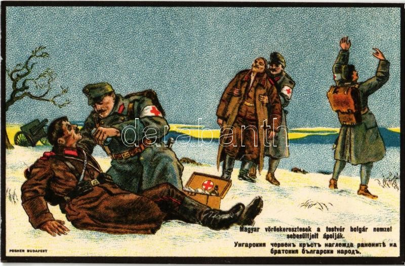 Magyar vöröskeresztesek a testvér bolgár nemzet sebesültjeit ápolják. Bolgár Vöröskereszt támogatására alakult Országos Bizottság, Posner Budapest / Hungarian Red Cross giving first aid to Bulgarian soldiers, litho