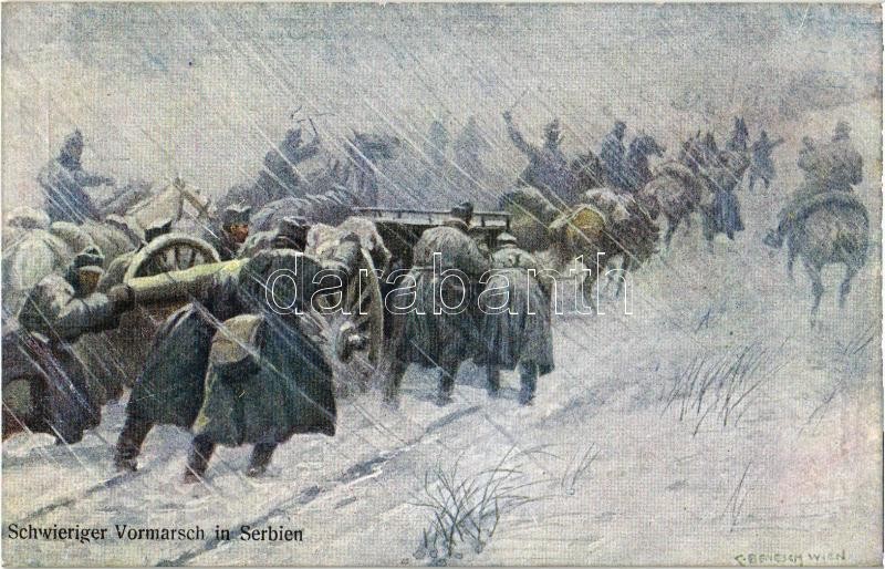 Schwieriger Vormarsch in Serbien. Kriegshilfsbüro Nr. 345. / WWI Austro-Hungarian K.u.K. military, difficult advance in Serbia, soldiers in the snow in winter s: Benesch + K. k. Landsturm-Inf. Baon K.u.K. Feldpostamt 633.