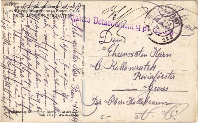 Beschreibung: Weihnachts-Stimmung. Weihnachtskarte des Kriegsfürsorgeamtes Bozen-Gries / WWI Austro-Hungarian K.u.K. military, Christmas card s: Oskar Wiedenhofer + K.u.K. Alpines Detachement Feldpostamt 222. (EK)