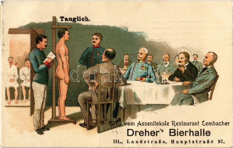 Vienna, Wien III. Landstraße, Hauptraße 97. Assentlokal Restaurant Rudolf Lembacher, Dreher's Bierhalle / Lembacher restaurant, inn and beer hall, humorous litho advertisement postcard