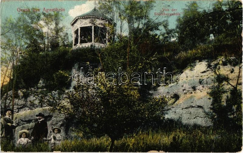 Beschreibung: 1910 Szentágota, Agnetheln, Agnita; Von der Steinburgshöh / Steinburg hegyi kilátó. Kiadja H. C. Lang / lookout tower, mountain (EK)