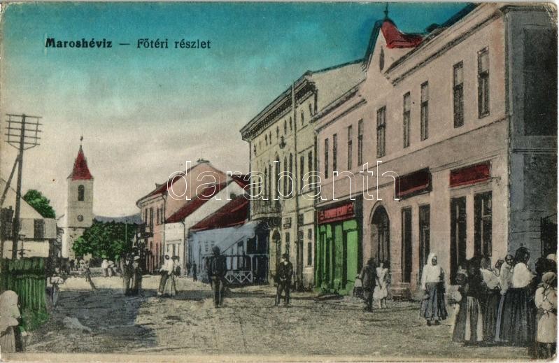 Beschreibung: Maroshévíz, Oláhtoplica, Toplita; Fő tér, üzletek, Református templom. Kiadja Szabó Fülöp / main square, shops, Calvinist church (EK)