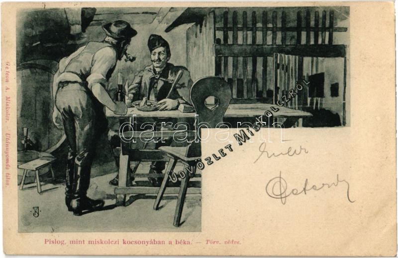 Beschreibung: 1900 Miskolc, Pislog mint miskolczi kocsonyában a béka, magyar folklór; Gedeon András kiadása