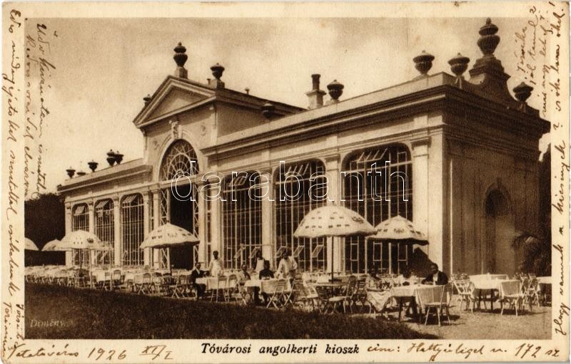 1926 Tata, Tata-Tóváros; Tóvárosi angolkerti kioszk, terasz. Kiadja Li... https://www.darabanth.com/de/347-Fernauktion/347.0/Ansichtskarten/Ungarn~2500005/1926-Tata-Tata-Tovaros-Tovarosi-angolkerti-kioszk-terasz-Kiadja-Lindenberg-Dimeny-felvete~II1972292