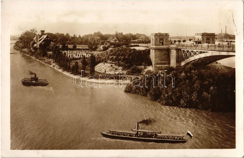 Beschreibung: 1928 Budapest XIII. Margitsziget, híd, gőzhajók