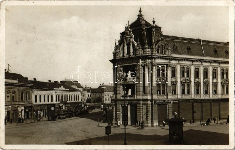 1934 Nyíregyháza, Rákóczi út, Nyíregyházi Takarékpénztár Egyesület palotája, Lieber és László, Schvartz Jenő, Stern Sándor, Vajda Jenő, Hoffmann, Deutsch József, Révész Jánosné, Gara Adolf üzlete, automobilok, hirdetőoszlop. Kiadja Fábián Pál (EK)